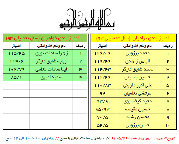 تاریخ تعیین جا: روز چهار شنبه 93/5/29